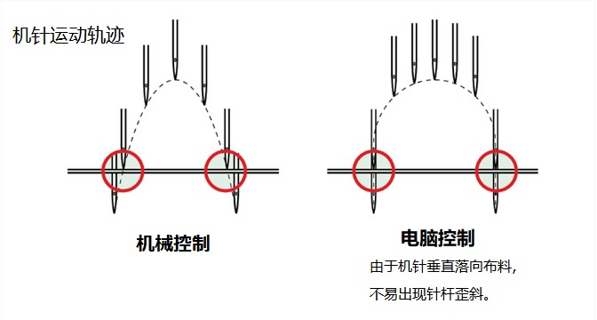 采用电脑控制,机针垂直落向布料,因此即使在高速缝纫下仍不易出现针洞。另外,针杆装置采用了伺服控制的脉冲马达,可有效防止错位。