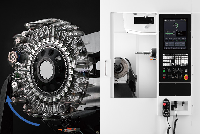 [卧式紧凑型多面加工中心]该卧式紧凑型多面加工中心标准搭载⌀680mm五轴转台,突破BT30机型规格限制,可实现大型及长尺寸工件的多面加工,进一步加速工序集约化。通过省空间设计与机电一体化开发,实现高效生产。