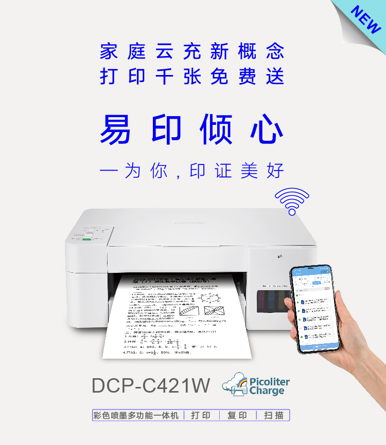 全新打印体验,只需购买页数,后期申领耗材白色靓机 易印倾心全封闭150页纸盒支持无线网络连接