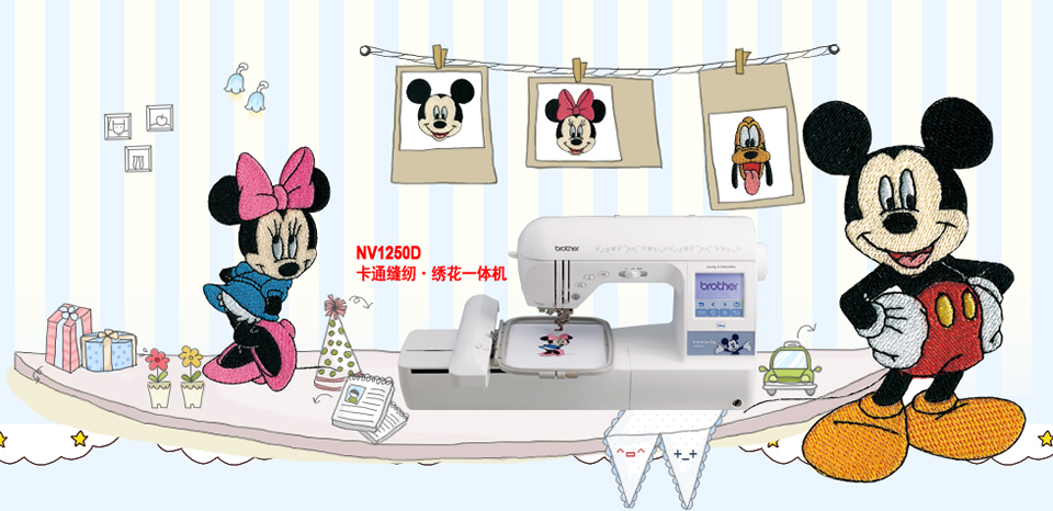 NV1250D 机身小巧、功能强大、内置上百种缝纫针迹以及丰富的绣花花样,其中包含35种生动可爱的迪士尼卡通绣花花样。