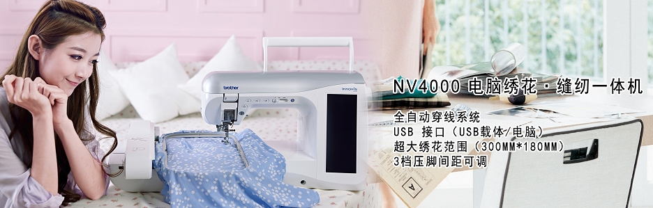 ·试想美梦成真带给您其乐无比的感觉,NV4000要您付出的只有想象。插上一双想象的羽翼,经历一番充满原创乐趣的生活吧!让您的时尚衣着、家居服饰乃至整个生活与众不同! ·NV4000集brother当前最先进的技术于一身必将使您的缝纫变得更方便,让您的作品更加令人满意,让您的创作过程趣味横生。 ·NV4000是让您将梦想变成现实的神奇伙伴!