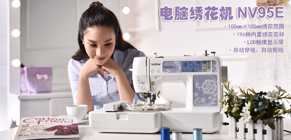 NV95E 机身小巧、功能强大、让您体验趣味绣花的无穷乐趣! 除了随机的 196 种绣花数据外,您还可以通过 USB 或绣花卡输入新的绣花数据, 无限增加您的绣花花样!