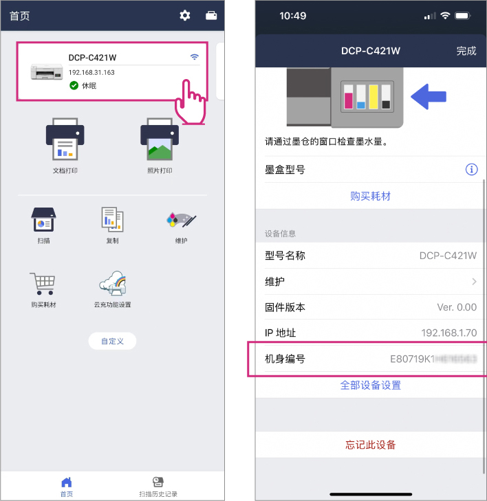 | 方式二: | 在Brother Moblie Connect点击已连接的打印机,在打印机详情页面中可以找到本机序列号(机身编号。 |