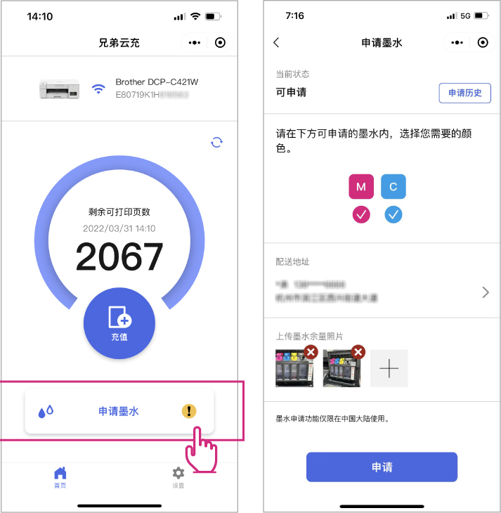 当墨仓中墨水量不足时,在云充主页的”申请墨水“按键边上会出现提示,进入申请界面后按提示填写耗材情况与收货信息后即可提交申请。
