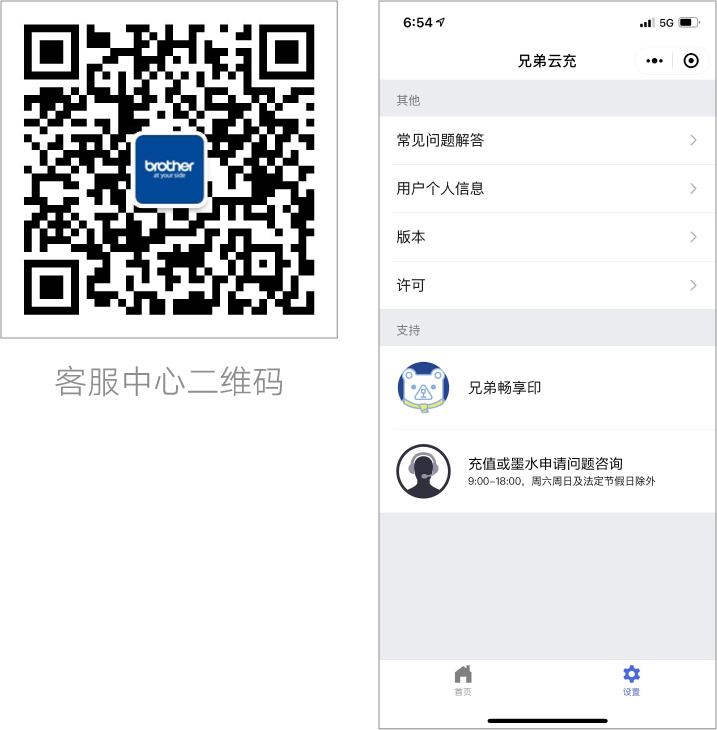 | 1. | 完成配网后,请在Brother Moblie Connect主界面中点击“云充功能设置”,进入“兄弟云充”微信小程序,根据页面提示进行领取/充值页数; |
