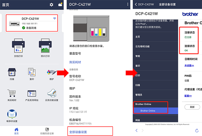 通过Brother Mobile Connect中的【全部设备设置】,进入EWS设置页面,在菜单左下角找到“Brother Online”,可以查看打印机注册与连接状态。